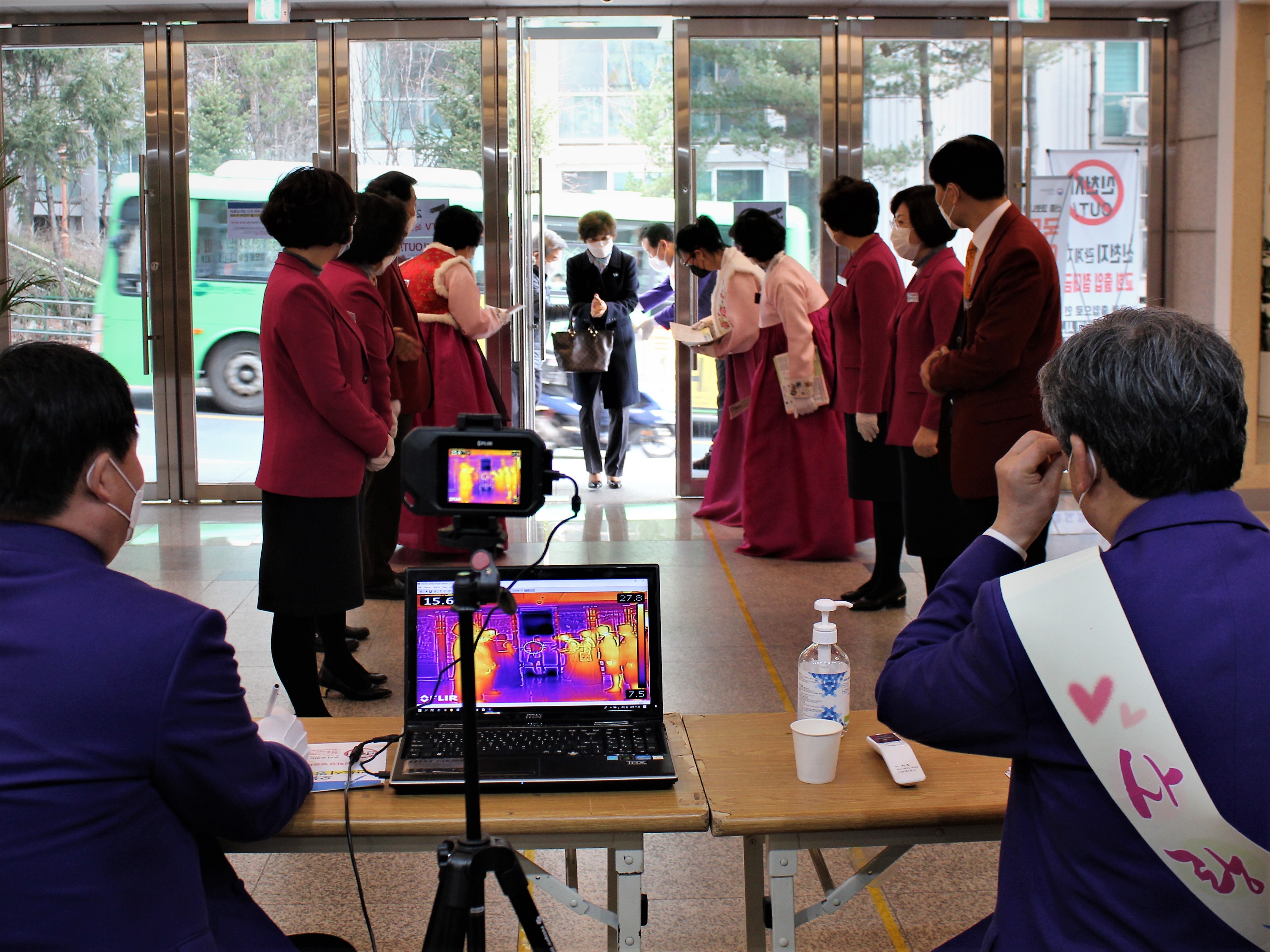 전염병확산을 막기위해 열감지카메라, 온도계등을 통해 출석하는 신자들을 일일히 체크하면서, 손소독과 마스크를 제공.
