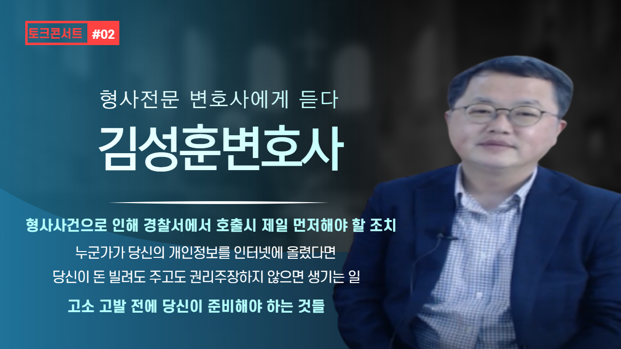 오늘은 형사전문 변호사이신 김성훈 변호사님을 모시고 토크콘서를 진행합니다. 형사사건으로 인해 경찰서나 검찰에서 호출할 경우. 죄를 짓지 않아도 불안합니다. 이런 경우 제일 먼저 어떻게 해야 할지 알아봅니다. 그리고 가까운 지인이나 전혀 모르는 사람이 여러분들의 개인정보나 사진등을 인터넷에 올린 경우 어떻게 할지, 그리고 지인에게 돈을 빌려주었는데 돈을 돌려 받지 못하는 경우, 어떻게 하면 이런 문제를 해결 할지에 대해 알아봅니다. 그리고 고소고발전에 무엇을 준비해야 할지도 알아보는 시간을 가지도록 하겠습니다.