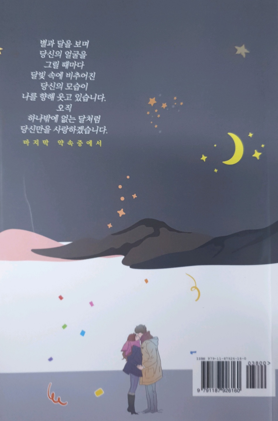 별과 달을 보며당신의 얼굴을 그릴 때마다달빛 속에 비추어진 당신의 모습이나를 향해 웃고 있습니다.오직하나밖에 없는 달처럼당신만을 사랑하겠습니다.마지막 약속중에서