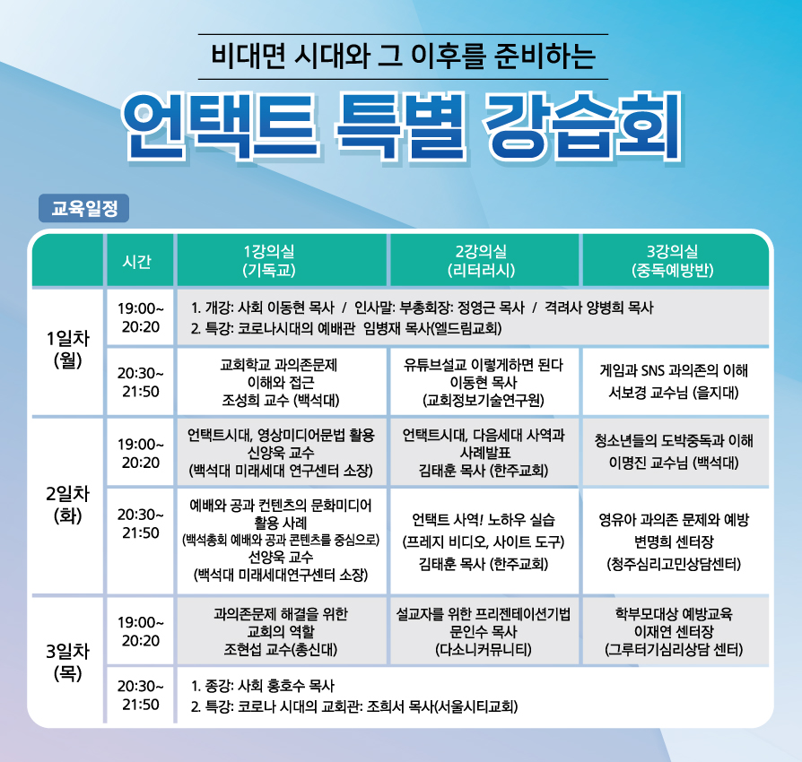 1. 수강하신 날짜와 시간 날짜에 따라 강의실에 입실하여 주시면 됩니다. 예를들면 1일차 유튜브설교 이렇게 한다는 강의를 수강하였다면 2강의실 접속경로를 클릭하여 접속하시거나 줌아이디와 비밀번호를 입력하여 접속할 수 있습니다.