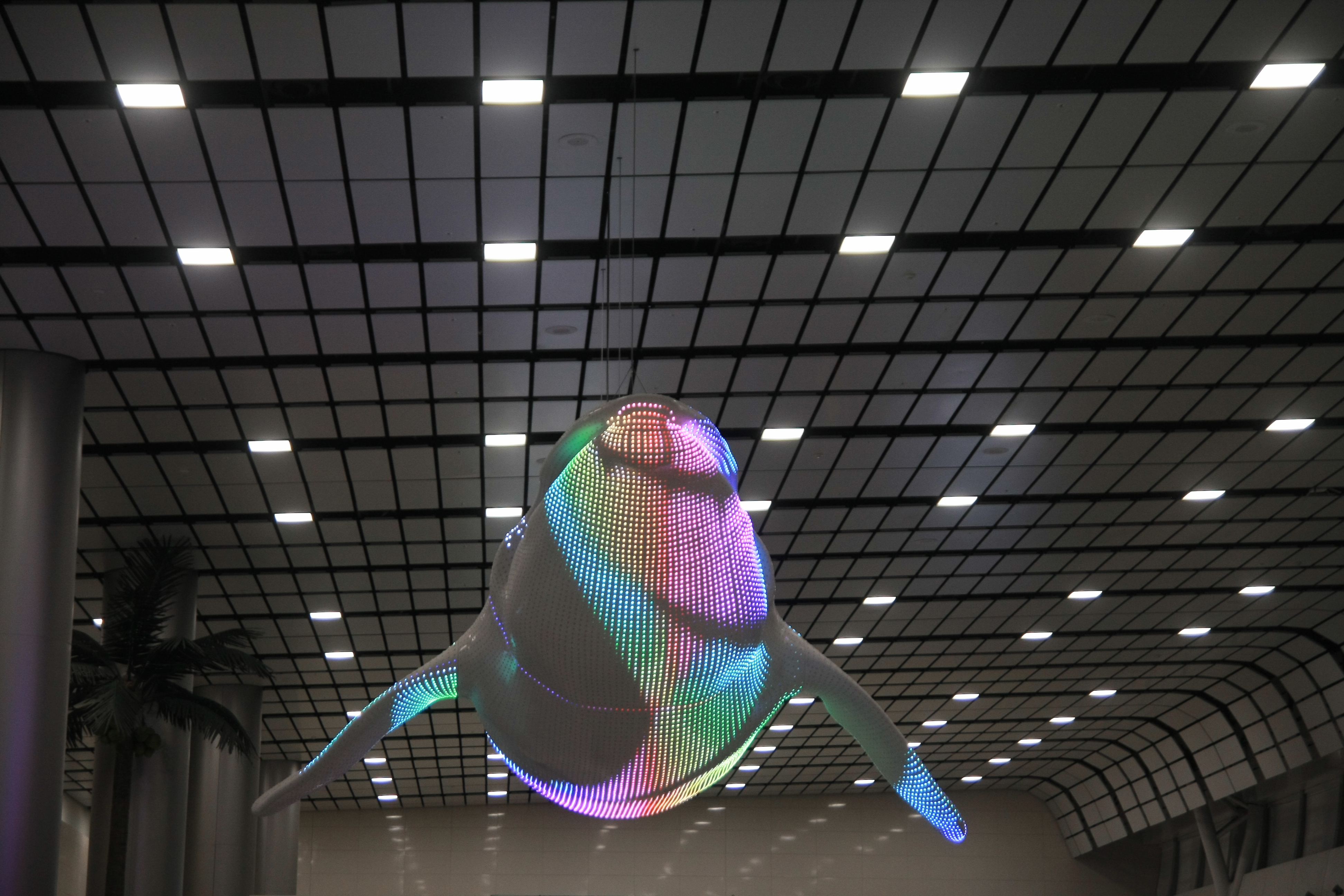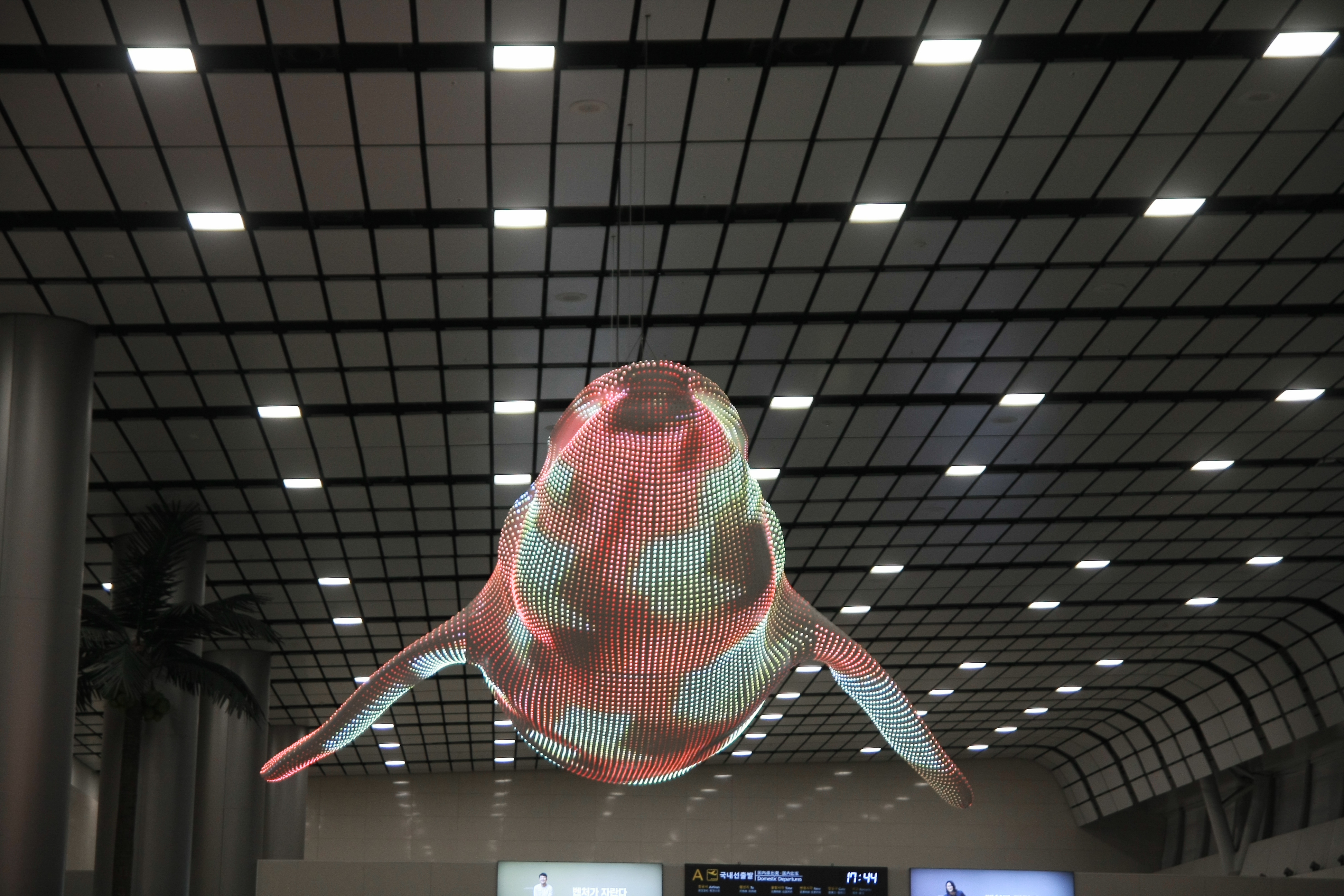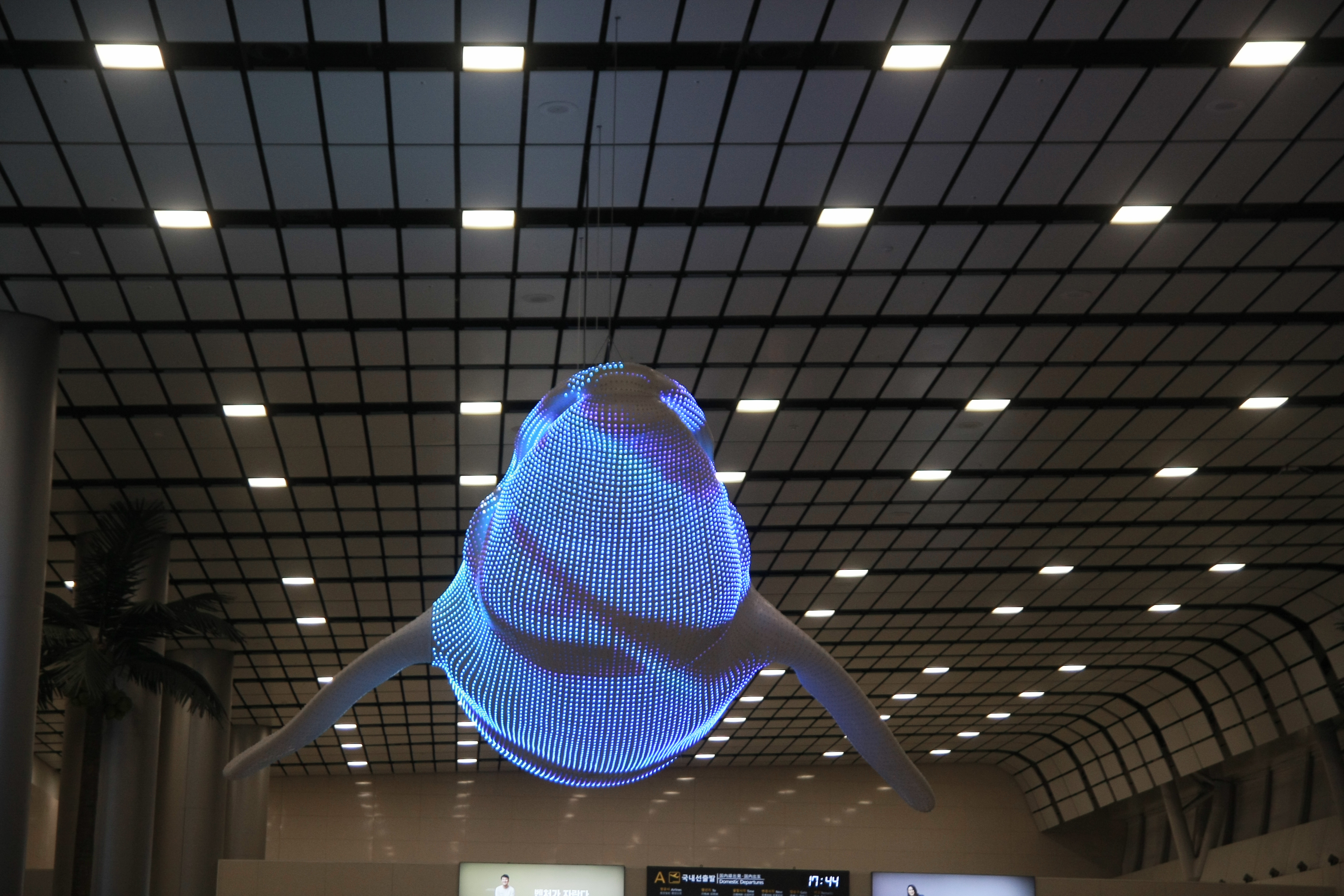 조형물을 바라보면서 순식간에 바꾸는 색상과 고래조형물속에 또 다른 조형물이 움직이는 모습을 보게 되었다. 다른 공항에서 보지 못하는 조형물. 고래, 제주 하늘에 날고 있는 것 같다.