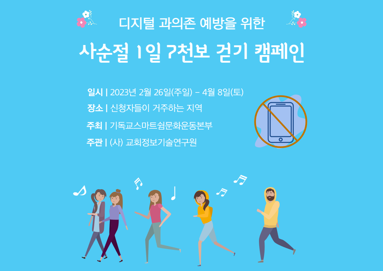 디지털 과의존 예방을 위한 걷기캠페인은 사순절 기간 동안 "스마트폰 내리고 기도의 손"올리고 라는 주제하에 40일간 매일 7천보를 걷게 됩니다. 묵상과 기도를 통해 자신을 돌아보고 스마트폰 습관을 다시 정립하는 계기가 될 것입니다. 이에 사순절 걷기 캠페인에 여러분들을 초대합니다.