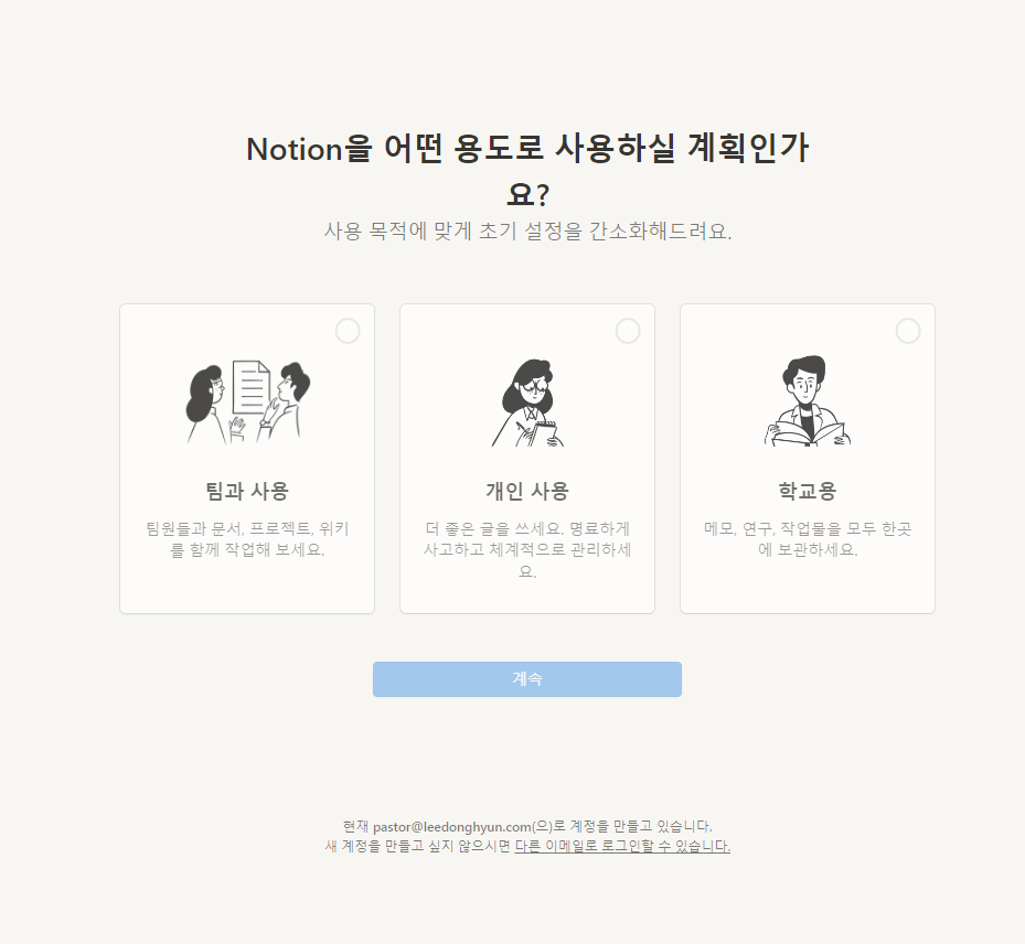 - 이미 로그인한 경우 현재 Notion 계정에서 로그아웃합니다.