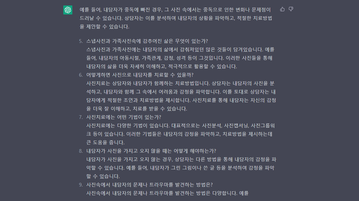 인공지능 Chat GPT에게 중독문제에 대한 이해를 바탕으로 중독문제를 해결하는 방안으로 사진치료기법에 대해 레포트로 만들라고 지시하였습니다. 지시조건은 아래와 같이 요청하였습니다. 이에 대해 관련 내용을 제시해 주었습니다. 하단에 디테일에하게 질문하게 될 경우 더 전문적인 에세이가 될 수 있겠지만 대략적인 에세이로 구조만 잡는다는 개념에서 접근해 보았습니다. 완벽한 에세이를 만들려면 좀더 구체적인 지시문이 있거나 관련된 중독이나 사진기법에 대한 세부적인 질문을 통해 만들어 나가야 합니다.