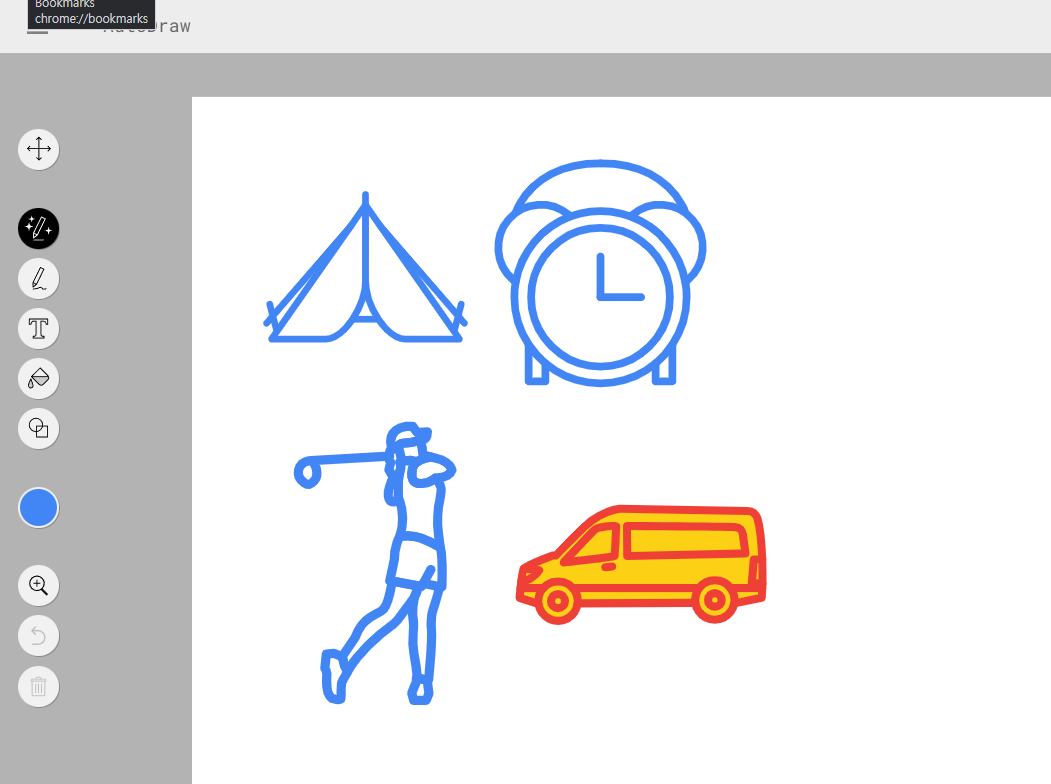 To use AutoDraw, simply select the second button under the arrow on the left-hand side of the screen, and start drawing on the white background on the right. As you draw, AutoDraw will use its image recognition capabilities to suggest a list of relevant images that you can select from to complete your drawing. The suggested images are ranked based on their similarity to the sketch you have drawn.