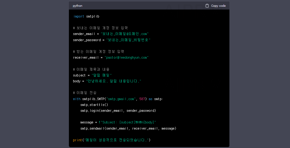 with smtplib.SMTP("smtp.gmail.com", 587) as smtp:을 사용하여 Gmail SMTP 서버에 로그인합니다. message 변수에 이메일 제목과 내용을 입력합니다. smtp.sendmail(sender_email, receiver_email, message)을 사용하여 메일을 보냅니다. print("알림 메일을 보냈습니다.")는 메일이 성공적으로 전송되면 출력됩니다.