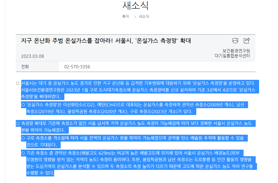 서울시는 대기 중 온실가스 농도 증가로 인한 지구 온난화 등 급격한 기후변화에 대응하기 위해 ‘온실가스 측정망’을 운영하고 있다. 서울시보건환경연구원은 2023년 1월 구로 도시대기측정소