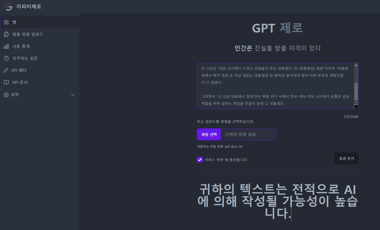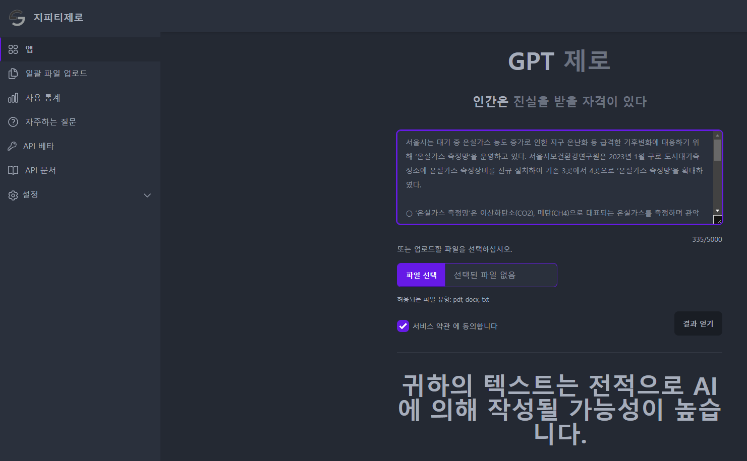 필자가 작성한 한글이나 신문기사, 보도자료등을 지피티제로 웹사이트에 넣어서 테스트해 본 결과 인공지능이 작성한 글인지 사람이 작성한 글인지 제대로 판별하지 못하는 것 같습니다. 한글이어서 그런 것인지 모르겟지만 상황은 제대로 판별하지 못한다는 나름대로의 결론을 내렸습니다. 아래에 서울시 공지사항과 신문기사의 일부를 넣어서 확인해 보았는데 그 결과도 인공지능이 적었다고 나왔습니다.