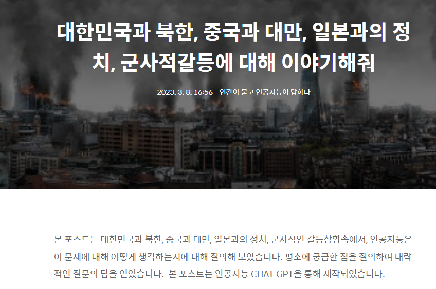 | 대한민국과 북한, 중국과 대만, 일본과의 정치, 군사적갈등에 대해 이야기해줘 (0) | 2023.03.08 |