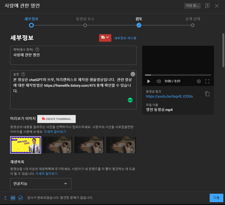 썸네일과 각종 정보를 입력한 후 다음을 클릭한다.
