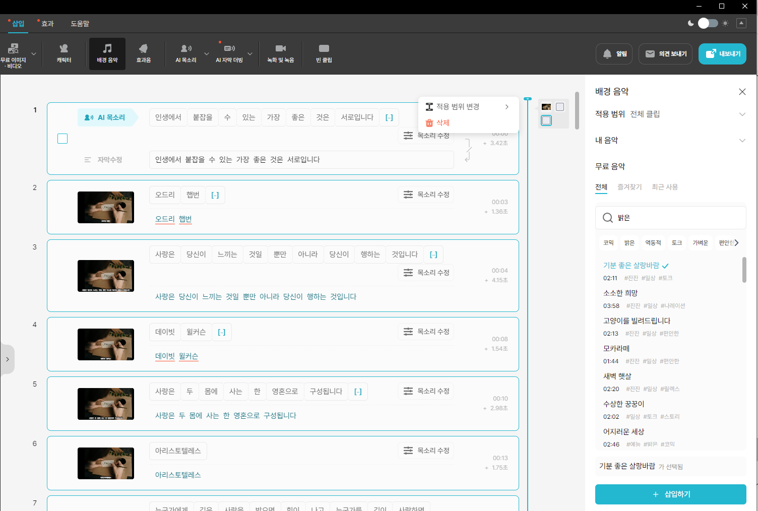 상단에 있는 배경음악메뉴를 선택한 후 우측에 나타나는 음악을 듣고 선택한다. 우측 상단에 적용범위를 전체클릭으로 적용시킨다.(음원길이만큼 이미지전체에 적용) 삽입에서 배경음악을 선택한다. 카테고리에서 검색하여 음원을 찾는다.