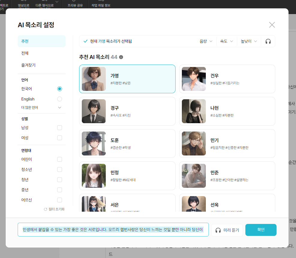다운로드 및 로그인 후 AI 음성 옵션을 선택하고