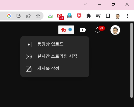 유튜브홈페이지에서 상단 카메라모양을 누른 후 동영상 업로드를 클릭합니다.