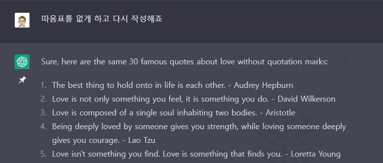 ChatGPT를 사용하려면 Google 계정으로 로그인하고 난 후 프롬프트에 명령어를 입력합니다. 그러면 따옴표가 나오는데 이때 따옴표를 사용하지 않고 작성하라고 챗gpt에게 명령한다. 주의사항은 질문은 영어하는 것이 좋다. 그런 다음 번역 프로그램에서 한국어로 된 인용문을 복사하여 붙여넣으십시오. Google 번역 또는 ChatGPT를 사용하여 인용문을 한국어로 번역하시면 됩니다.