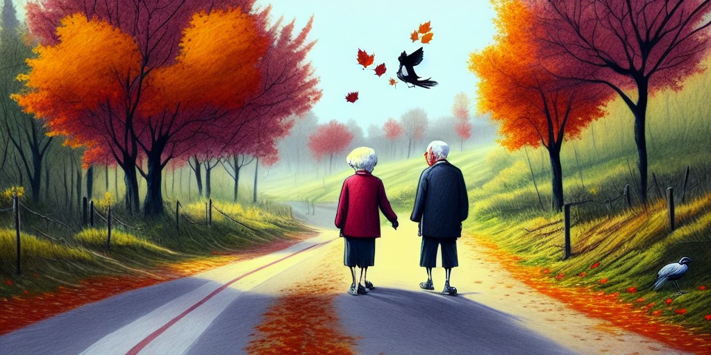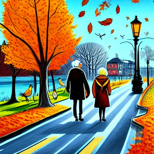 When I wake up in the morning, the birds sing and I draw a picture of an elderly couple walking down the street in an autumn landscape with falling leaves.