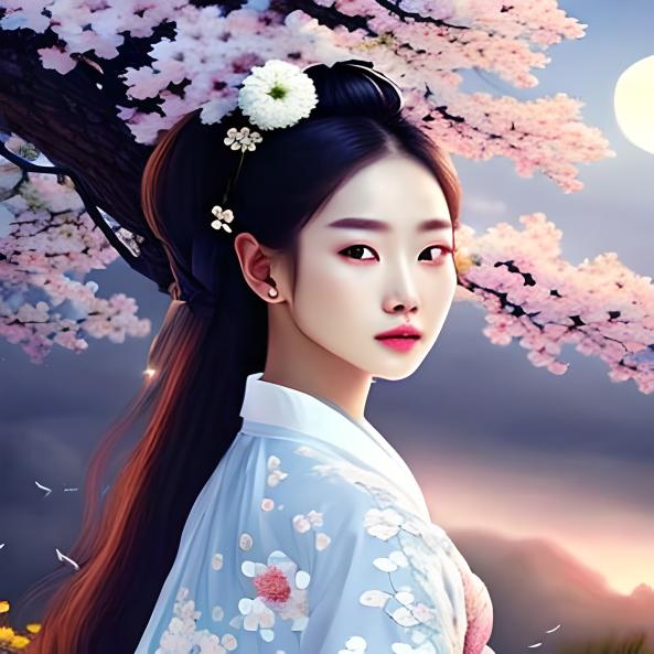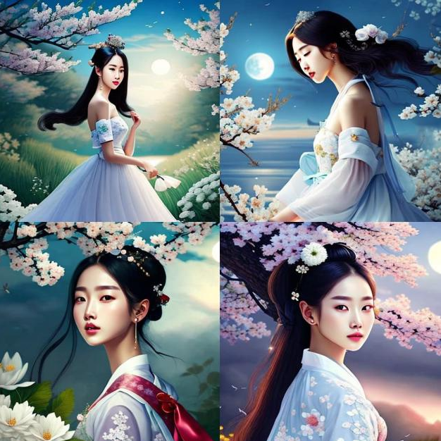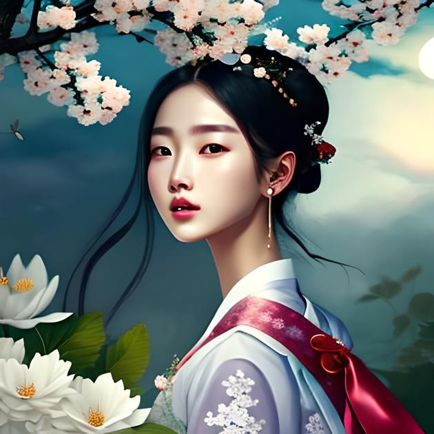 masterpiece, korean woman, pretty, cute,moonlight, white blooming flower background