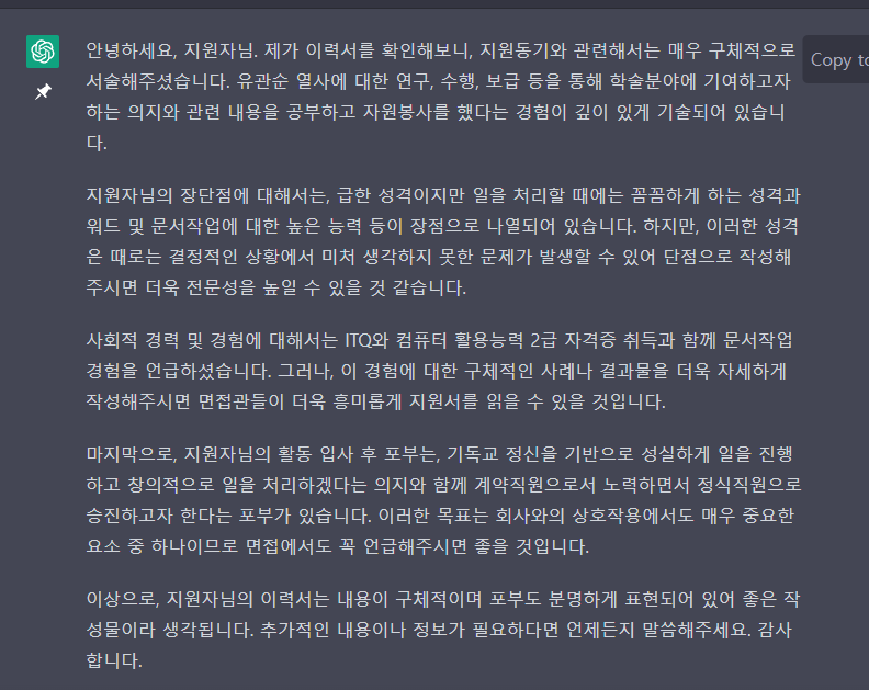 본포스트는 인공지능 ChatGPT로 작성하였으며, 실제사례를 통해 자기소개서를 작성하도록 하겠습니다.