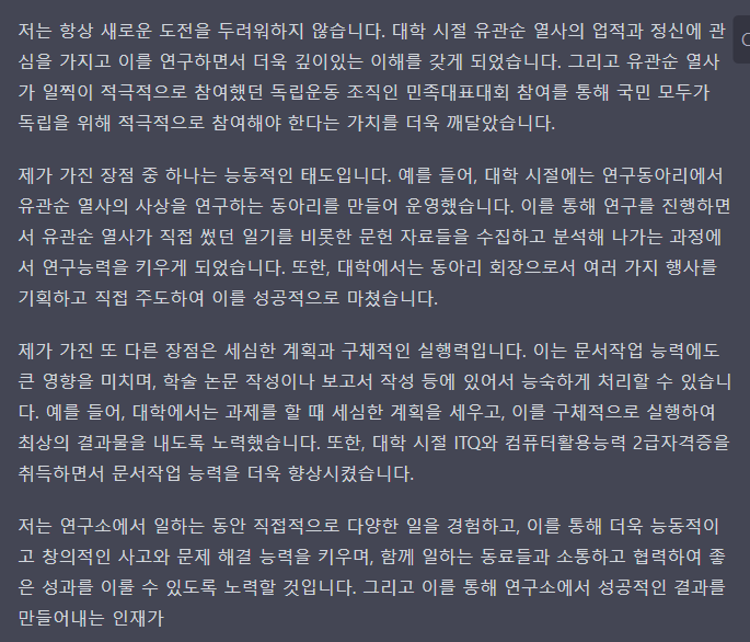 아래는 인공지능이 작성한 자기소개서 입니다.