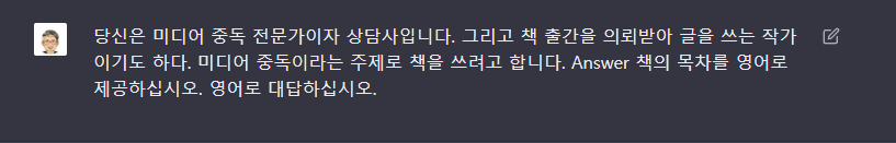 본 포스트에서는 ChatGPT에게 글의 목적과 방향을 설명하고 그에 따른 목차를 만들어 달라고 요청할 것입니다. 그러기 위해서는 어떤 책을 어떤 주제로 글을 쓸 것인지를 알려줘야 합니다. 필자의 경우 미디어 중독에 대한 글을 적고 그에 따른 목차를 만들려고 합니다.