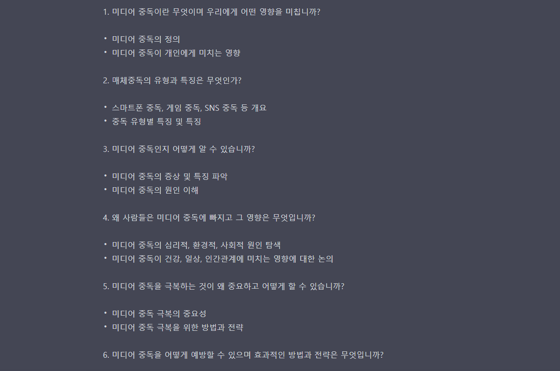아래의 내용은 지난 시간 작성한 청소년들을 위한 미디어중독 목차입니다. 아래의 목차를 인공지능에게 질문형으로 만들어 달라고 요청하겠습니다.