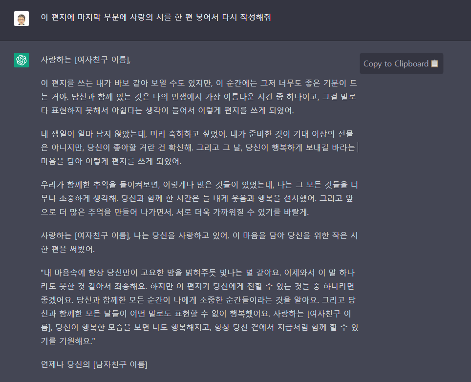 이상과 같이 인공지능과 연예편지를 작성하는 방법에 대해 배워 보았습니다. 여러분들은 지금 어떤 경험하고 하고 계신가요.