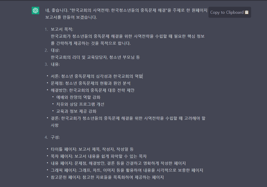 "한국교회의 사역전략: 한국청소년들의 중독문제 해결"을 주제로 한 원페이지 보고서를 만들어 보겠습니다.