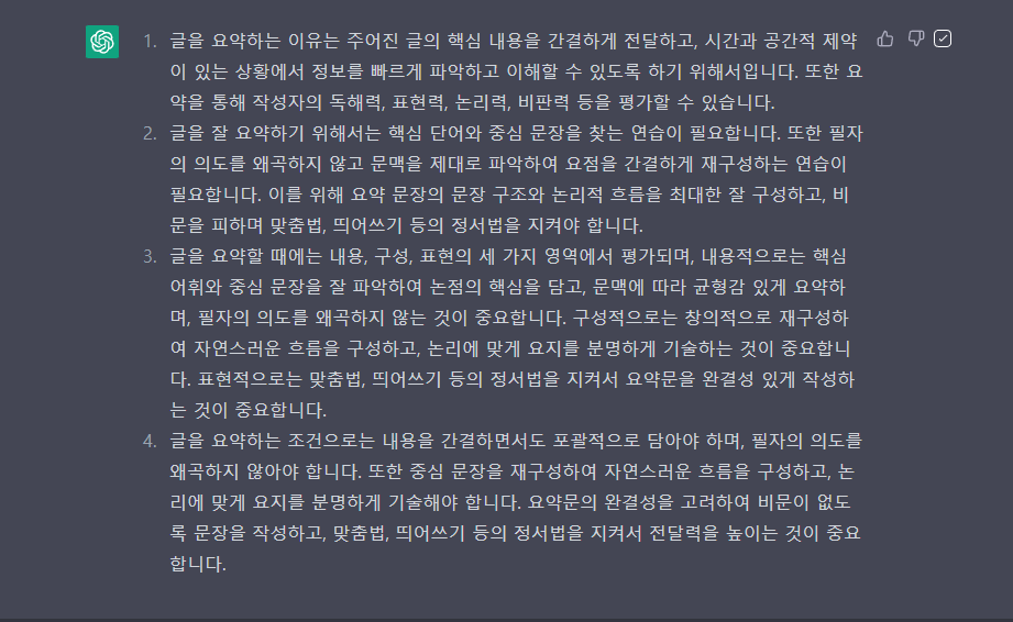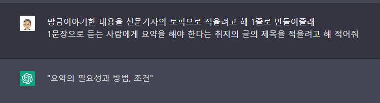 그래서 인공지능에 이 부분에 대해 물어보았습니다. "너는 특정한 글을 읽거나 너와 내가 대화한 내용을 요약해 달라고 요청하면 어떻게 요약하니"라고 질문해 보았습니다.