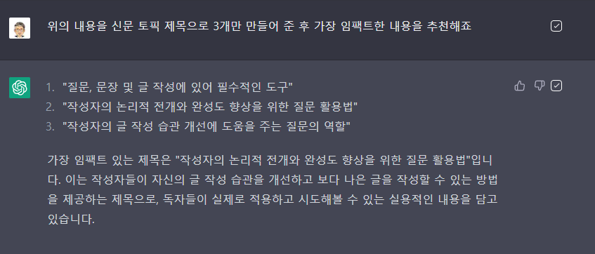 나름 요약이 잘 되었는 것 같네요. 이번에는 위의 내용을 가지고 신문기사로 사용할 토픽을 3개를 뽑으면서 그중에 하나를 추천해 달라고 했습니다.