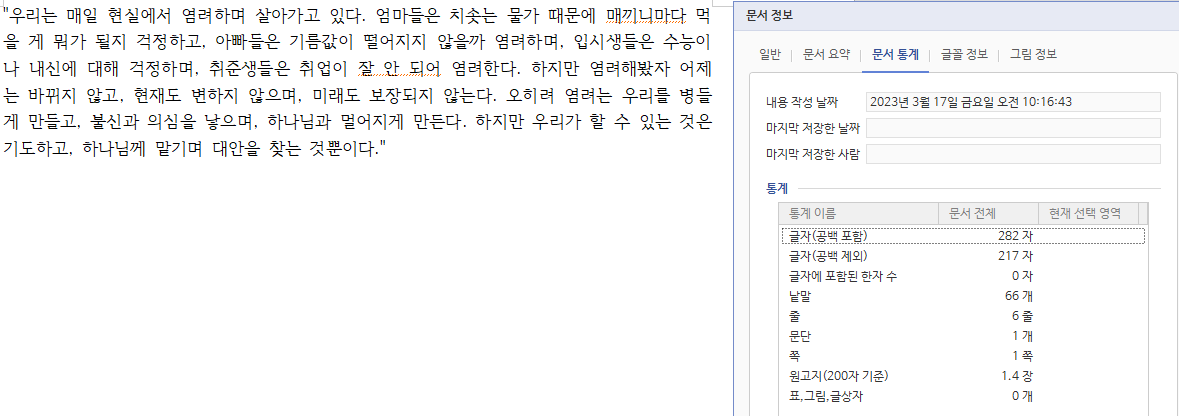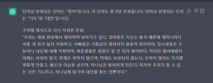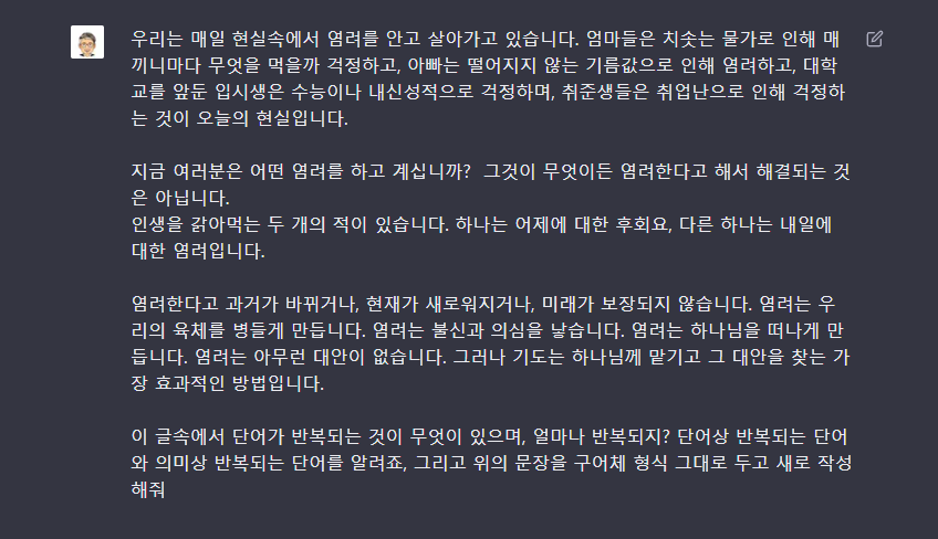 인공지능은 필자가 작성한 글에서 염려라는 단어가 9번 반복되고 있고 기도와 대안이라는 내용이 의미상 동일하다고 지적하고 있습니다. 그리고 구어체로 다시 작성해 달라고 요청하니 매우 깔끔한 문장이 나왔네요. 그렇다면 글자는 얼마나 요약했을까요 기존의 원고을 보면 원고지 2.9장에 516자라고 하고 있습니다.