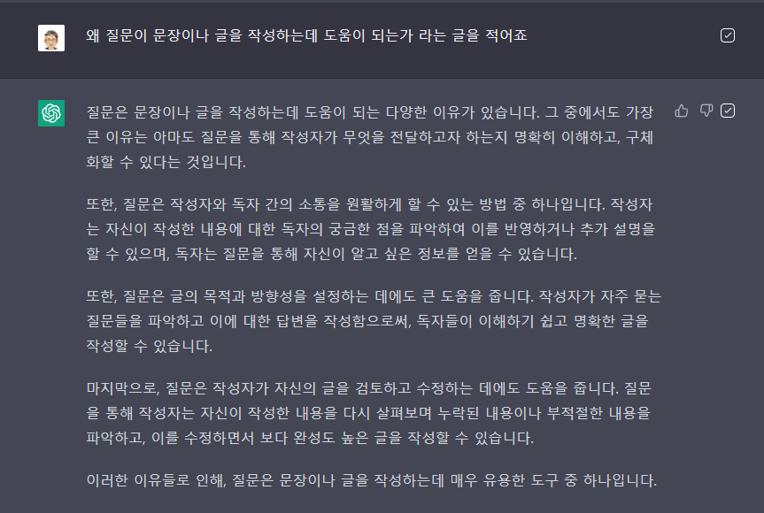 이러한 이유들로 인해, 질문은 문장이나 글을 작성하는데 매우 유용한 도구 중 하나입니다.