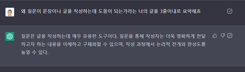 모든 이유들을 종합해보면, 질문은 문장이나 글을 작성하는 데 있어서 매우 유용한 도구입니다. 질문을 통해 작성자는 자신의 주장을 강화하고 논리적으로 전개하며, 자신의 글을 다양한 시각에서 바라볼 수 있고, 완성도를 높일 수 있습니다. 따라서, 질문하기는 글을 작성하는 과정에서 필수적인 습관 중 하나입니다.