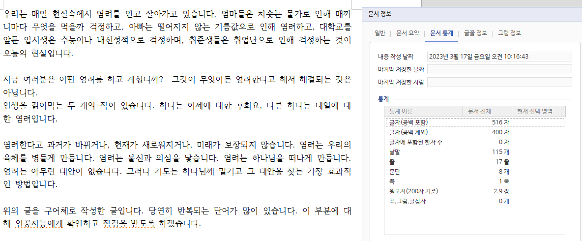 인공지능은 필자가 작성한 글에서 염려라는 단어가 9번 반복되고 있고 기도와 대안이라는 내용이 의미상 동일하다고 지적하고 있습니다. 그리고 구어체로 다시 작성해 달라고 요청하니 매우 깔끔한 문장이 나왔네요. 그렇다면 글자는 얼마나 요약했을까요 기존의 원고을 보면 원고지 2.9장에 516자라고 하고 있습니다.