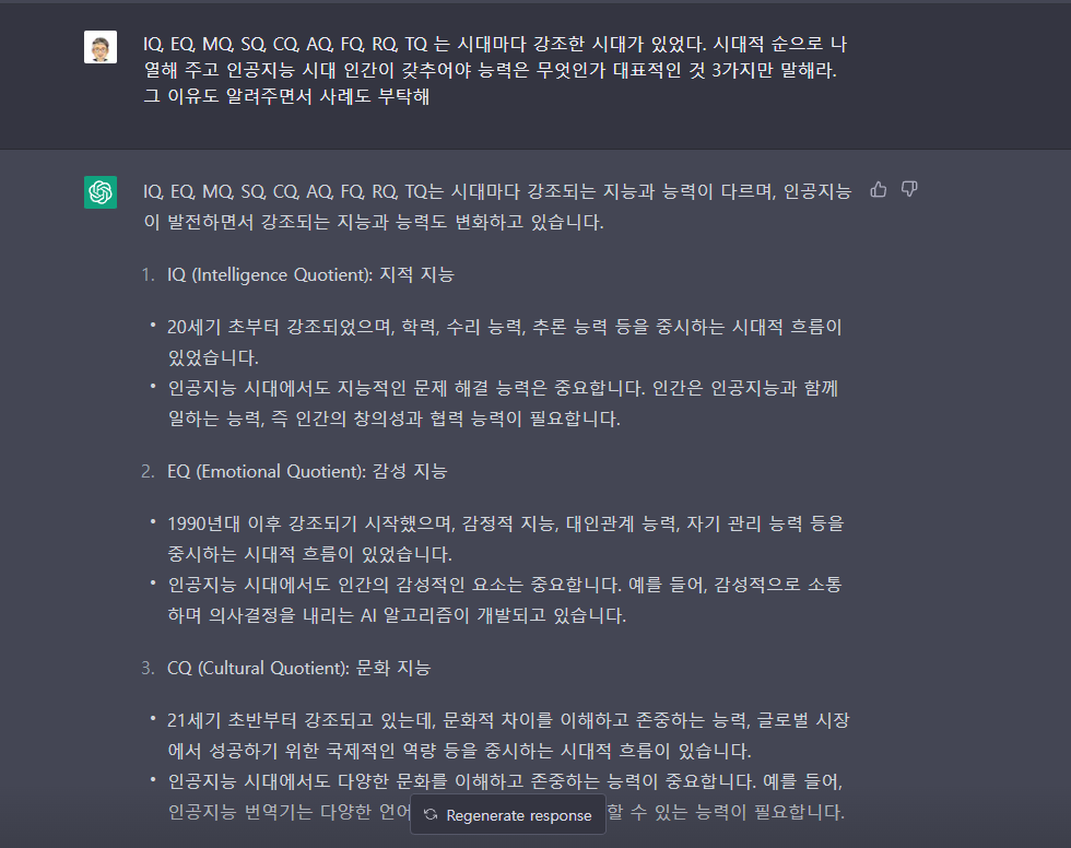 이러한 시대에서 살아남으려면 인공지능보다 IQ가 높을 수 없습니다. 인공지능보다 빨리 일하려고 해서도 안됩니다. 이 분야는 이제 인공지능의 몫입니다. 그렇다고 공부를 하지 말라고 하는 말은 아닙니다. 인공지능과 대화하려면 더 많이 배워야 합니다. 인공지능의 오류를 잡아줄 사람이 있어야 인공지능이 제 역할을 할수 있기 때문입니다.