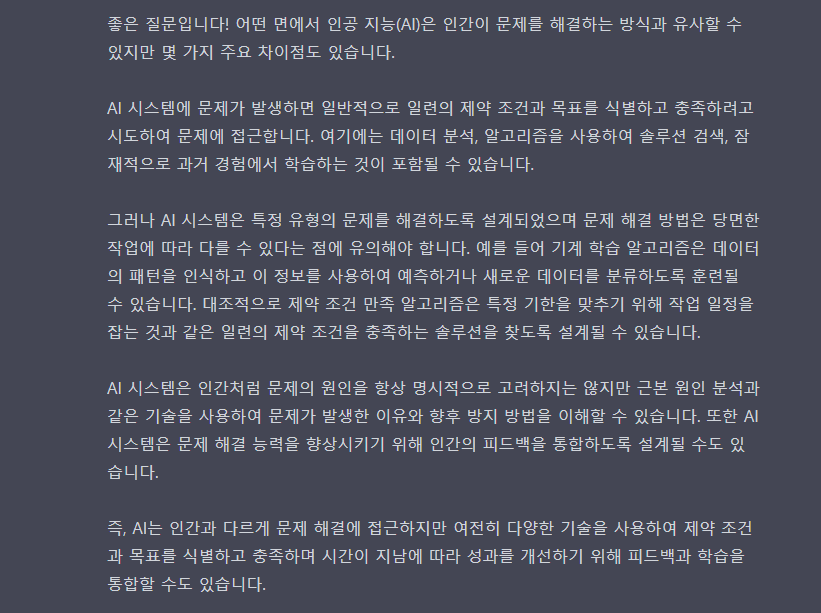 좋은 질문입니다! 어떤 면에서 인공 지능(AI)은 인간이 문제를 해결하는 방식과 유사할 수 있지만 몇 가지 주요 차이점도 있습니다.