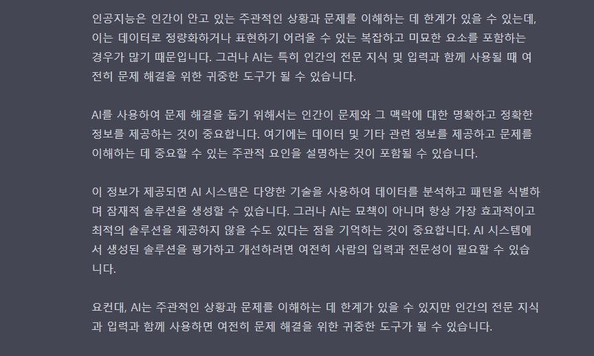 요컨대, AI는 주관적인 상황과 문제를 이해하는 데 한계가 있을 수 있지만 인간의 전문 지식과 입력과 함께 사용하면 여전히 문제 해결을 위한 귀중한 도구가 될 수 있습니다.