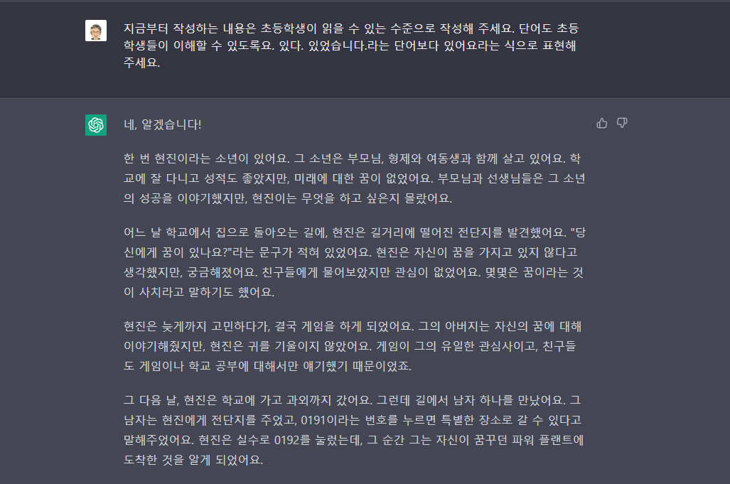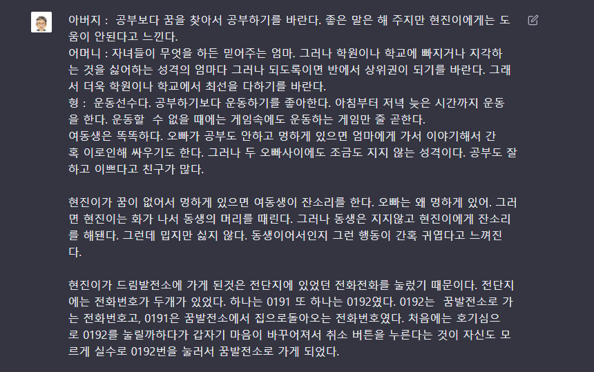 인공지능은 현진과 그의 가족, 친구들에 대한 기본정보를 제공해 달라고 합니다. 그래서 아래와 같이 내용을 보강해서 재입력을 했습니다.