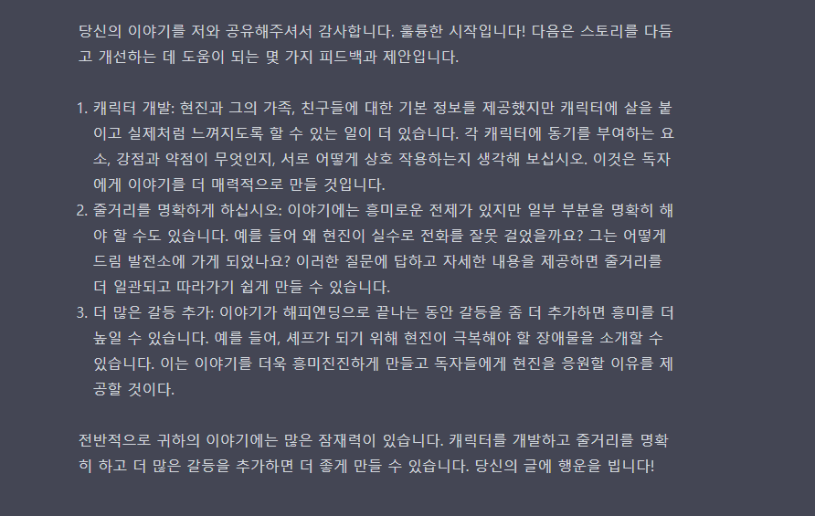 글을 마무리하면서 정말 생각보다 힘들다고 것이 느껴집니다. 인공지능에게 내가 생각하는 것을 전달하고 인공지능 자체가 그 내용을 인식하여 수정하는 과정이 생각보다 쉽지 않다는 사실을요. 그럼에도 보람도 있습니다. 어떻게 하면 조금더 인공지능과 대화하는 방법이 익숙해 지는지에 대해서요.