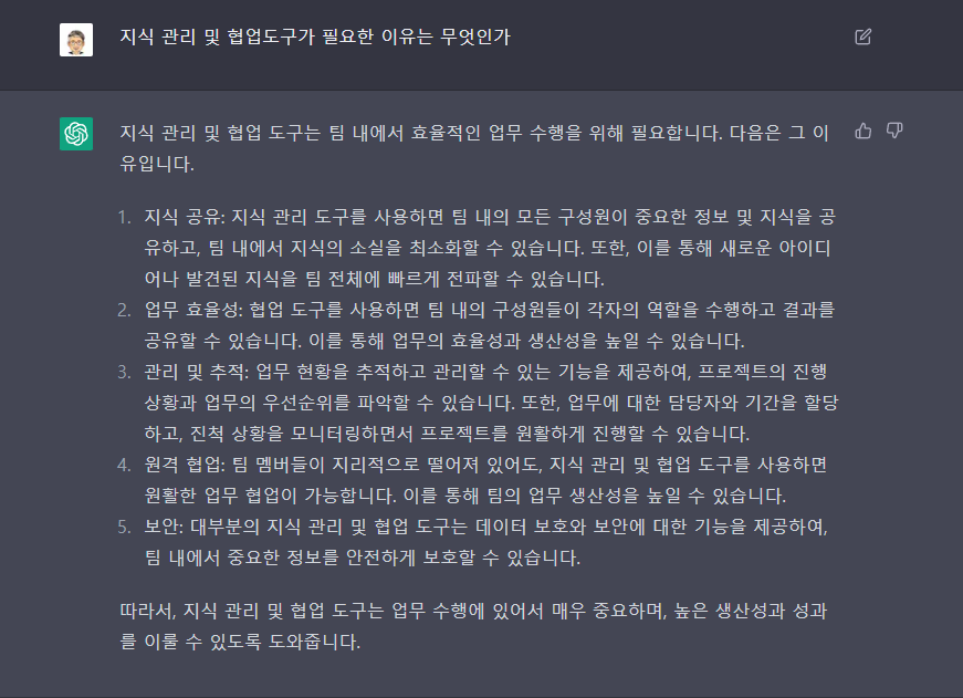 따라서, 지식 관리 및 협업 도구는 업무 수행에 있어서 매우 중요하며, 높은 생산성과 성과를 이룰 수 있도록 도와줍니다.