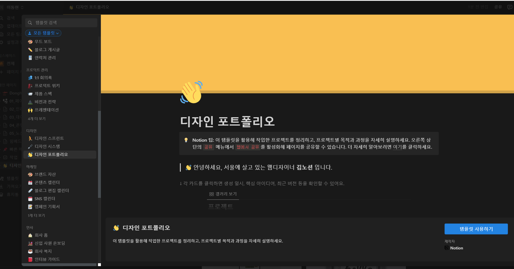 Notion 팁: 이 템플릿을 활용해 작업한 프로젝트를 정리하고, 프로젝트별 목적과 과정을 자세히 설명하세요. 오른쪽 상단의 공유 메뉴에서 웹에서 공유를 활성화해 페이지를 공유할 수 있습니다.