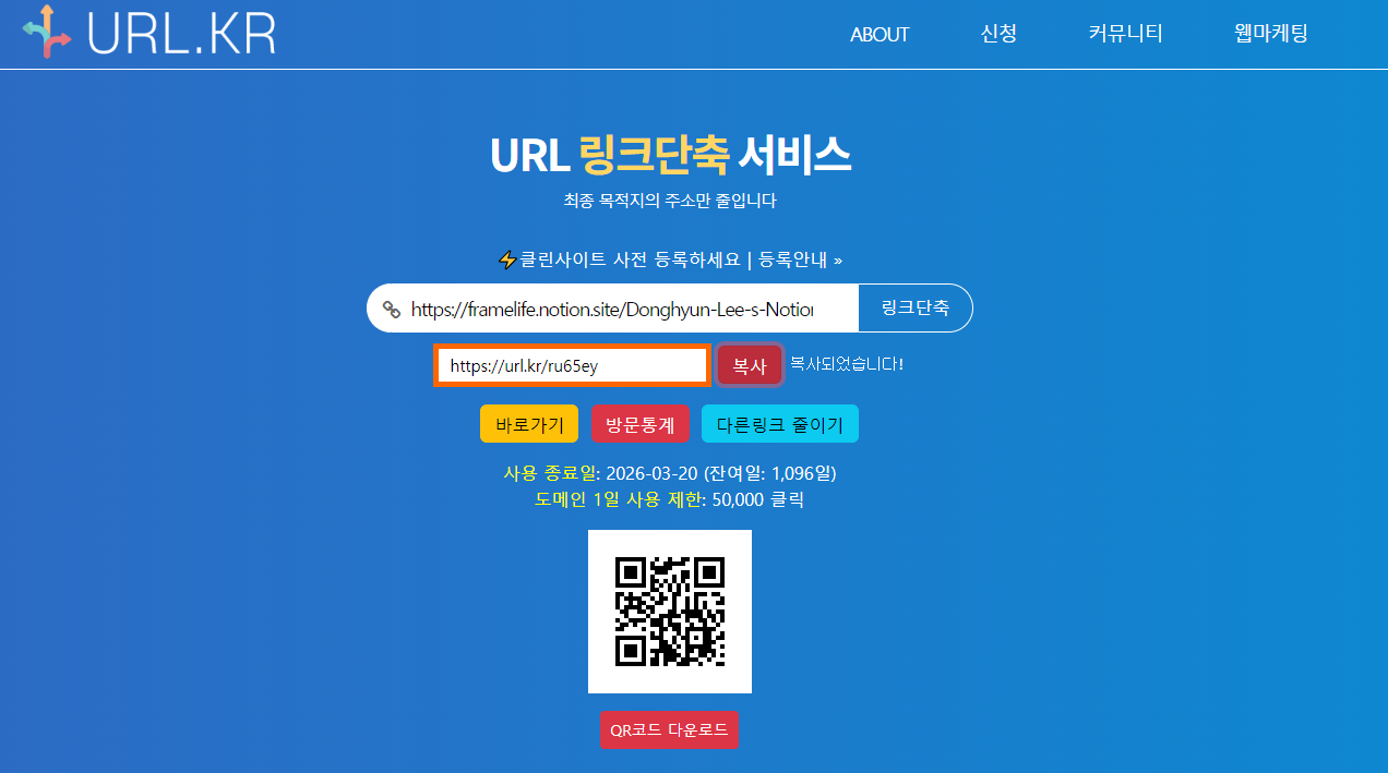 긴 인터넷 링크주소 url을 짧게 줄여 주는 URL 링크단축 서비스로 큐알코드 생성, 통계서비스 제공 합니다.