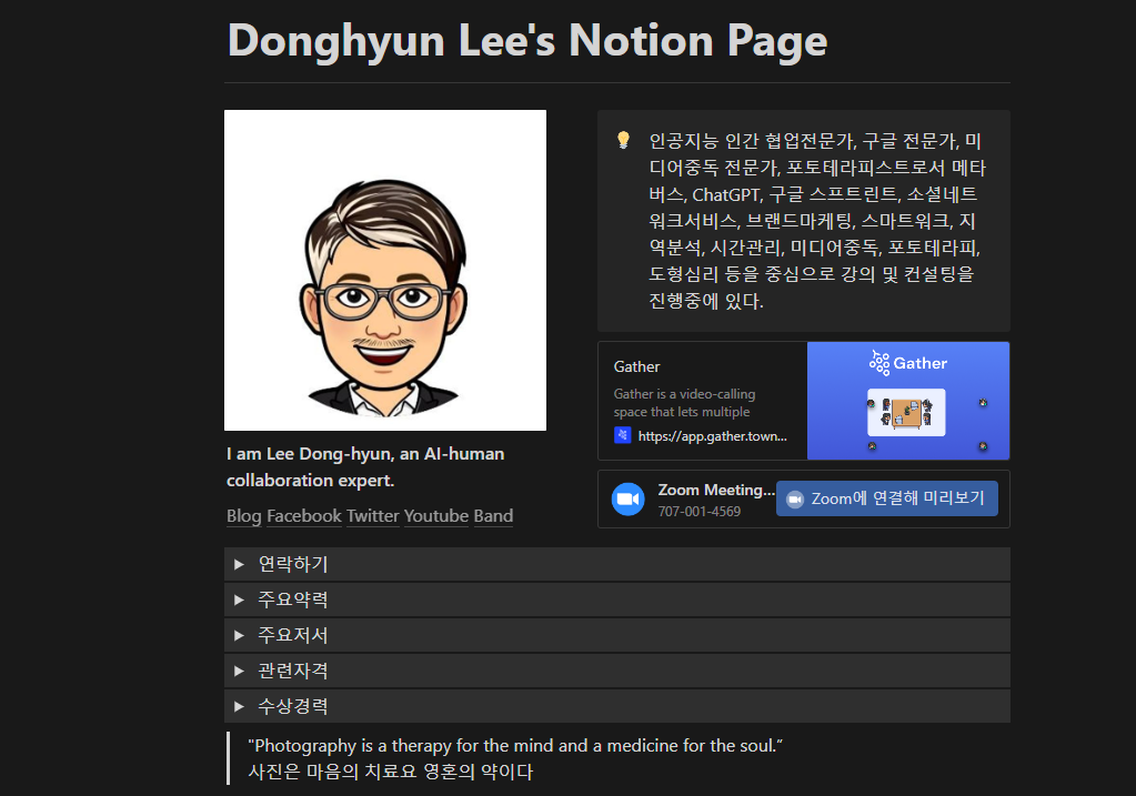 메인페이지 - 인사말, 소개글, 연락처,이메일, sns 등을 입력한다. 필자의 경우 아바타사진과 우측에는 간략한 자기소개, 우측하단에는 필자가 운영하는 메타버스 게더타운 상담실, 줌회의실이 있으며 아래에는 연락처와 약력, 저서등이 있다.