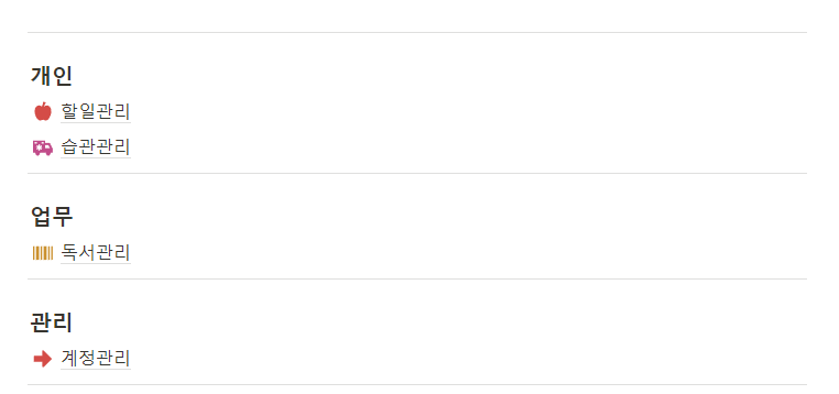 할일관리, 습관관리, 독서관리, 계정관리를 개인업무로 구분할지, 회사업무로 구분할지를 생각해 봅니다. 하나로 다 할 수 있지만 학습을 위해 구분해 보도록 하겠습니다. 혼자만 사용하신다면 이 부분은 패스해도 됩니다. 그러나 직장이나 학교에서 해야 할 부분이라면 구분하는 것이 좋을 수 있습니다.