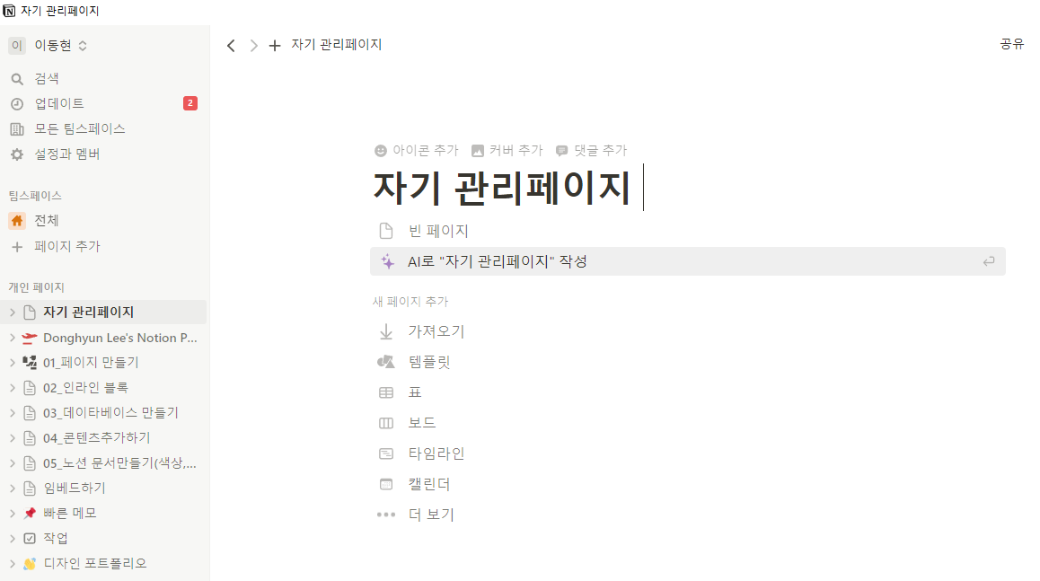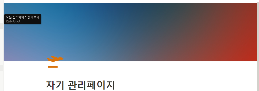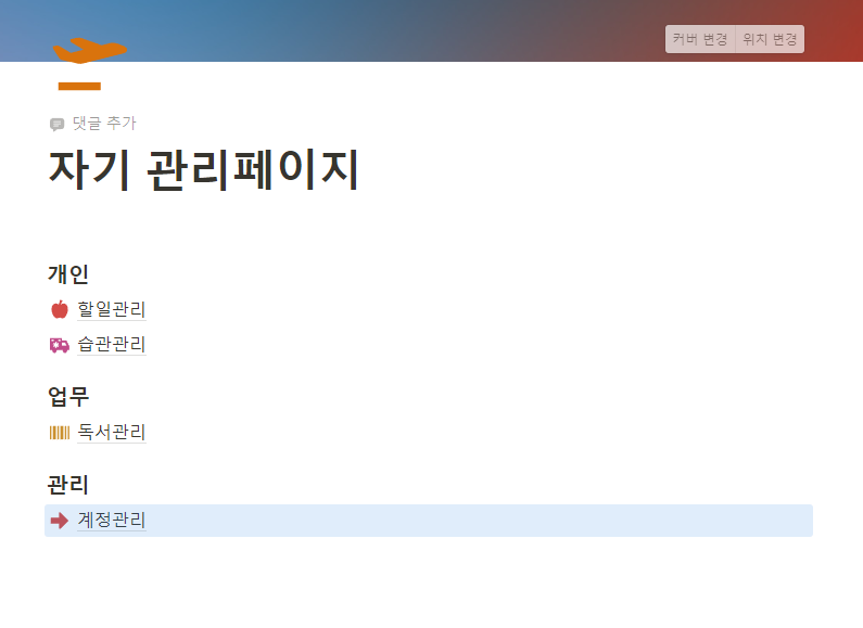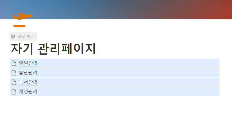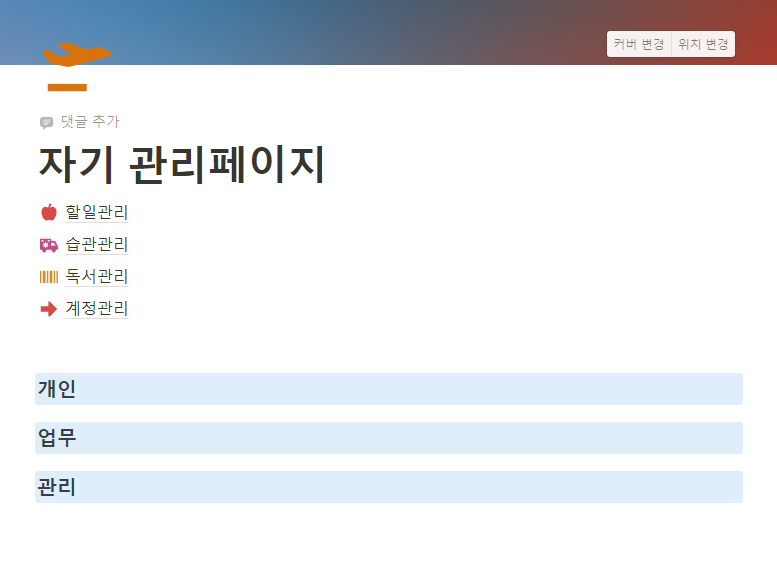 좌측에 보이는 페이지 추가 버튼을 눌러서 새로운 페이지를만든 후 상단 제목에 자기 관리페이지(나중에 이름을 변경)를 만듭니다. 상단에 있는 아이콘을 눌러 자기 페이지에 어울리는 이미지를 선택하고 커버를 추가하여 이미지를 넣습니다. 만약 원하는 이미지가 없다면 자신이 가지고 있는 이미지를 넣거나 unsplah 웹사이트에서 찾아서 추가할 수 있습니다. 페이지 본문에 마우스를 놓은 후 /image을 입력한 후 마음에 드는 이미지를 넣을 수 도 있습니다.