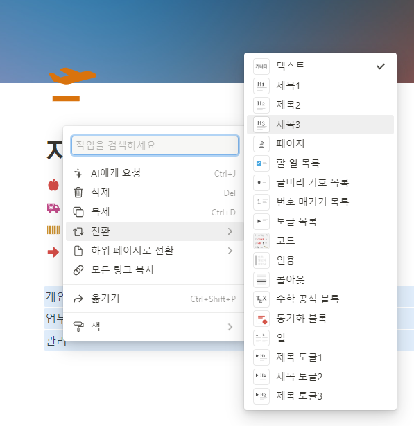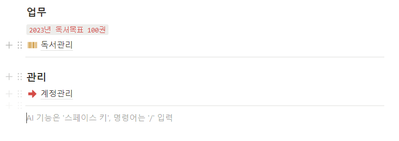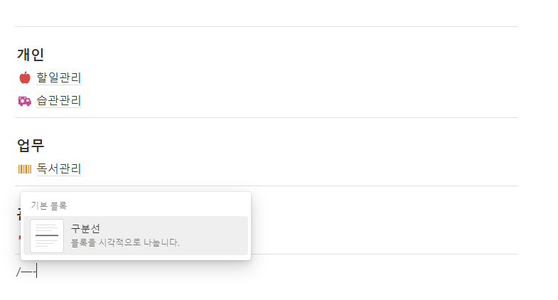 이제 개인과 업무, 관리사이에 구분선을 넣어서 구분해 보도록 합니다. 페이지 빈 곳에 마우스 커서를 올려놓고 키보드의 /를 눌러 구분선을 선택하세요. 단축키로 입력시 - 키를 3번 누르시면 됩니다.