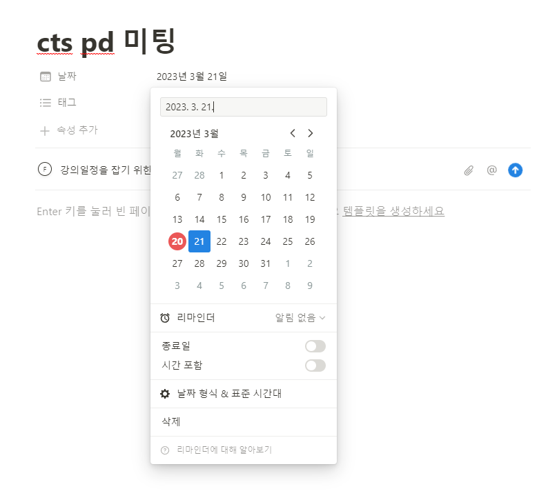 참고로 마감일 있는 미팅의 경우라면 일정을 입력시 종료일, 시간포함등의 정보를 함께 체크하시면 됩니다. 태그에는 학교, 개인, 업무, 취미, 독서등의 이름으로 넣을 수 있습니다. 그렇게 하면 갤린더에서 확인시 태그로 검색할 때 빠르게 해당 내용을 찾을 수 있습니다