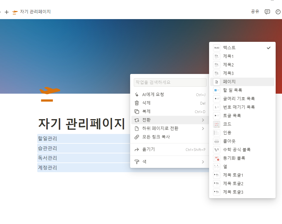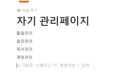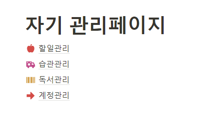 자신이 관리해야 하는 페이지가필 무엇인지 먼저 생각하세요. 그리고 타이핑을 쳐서 입력합니다. 필자의 경우 할일관리, 습관관리, 독서관리, 계정관리가 필요한 것 같아서 항목과 페이지이름을 방금 언급한 것으로 만들고자 합니다.