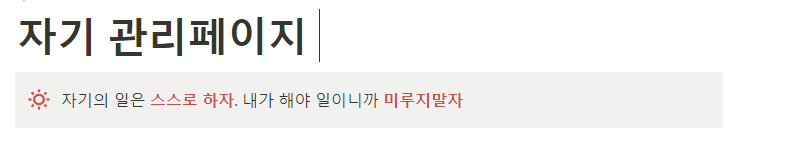 마지막으로 다짐이나 이달의 목표라는 것을 노출하여 해당 페이지에 방문했을 때 도전을 받을 수 있도록 하는 것을 꾸며 보도록 하겠습니다 개인위나 관리 아래에 넣을 수 있는데 필자의 경우 아무래도 개인위에 넣는 것이 좋겠습니다. 목표나 다짐의 내용은 메뉴에서 콜아웃을 찾거나 프롬프트에서 /callout 을 눌러서 입력할 수 있습니다. 해당 내용을 입력하면 기본적으로 전구 아이콘이 타나납니다. 전구 아이콘을 클릭하면 원하는 아이콘으로 변경할 수 있습니다. 마음에 드는 아이콘을 선택하여 변경할 수 있습니다. 그러면 목표가 강조되는 글을 적을 수 있습니다. 콜아웃내에서도 글자폰트나 색상등을 변경할 수 있어요. 변경하고자 하는 폰트위에 드래그한후 영역을 잡고 마우스우측을 누르면 메뉴에서 선택하여 글자모양을 변경할 수 있습니다.