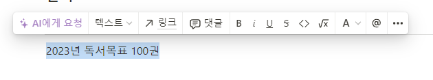 업무바로 밑에 구체적인 독서 목표를 넣기 위해 텍스트를 입력한 후 2023년 독서목표 100권이라고 입력한 후 해당 텍스트를 드래그한 후 영역을 잡고 나서 마우스 우측을 누르신 후 <>를 선택한 하면 글자가 변경됩니다.