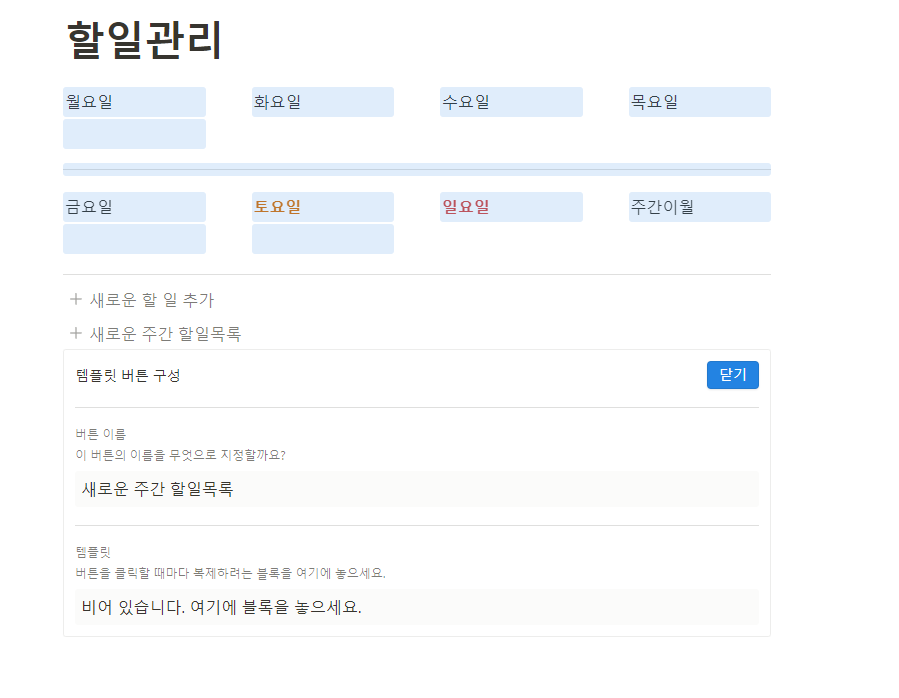 상단에 보시면 이전에 할일 리스트가 모두 삭제된 것처럼 깨끗하게 만든 상태에서 일정 블록 전체를 마우스로 드래그한 후 템플릿칸으로 옮기면 됩니다. 템플릿을 넣으면 블록이 파란색으로 변합니다. 원하는 블록이 모두 들어가도 해야 하는 것이 중요합니다. 다하셨다면 닫기를 눌러 설정을 마치면 됩니다. 그러면 새로운 주간 할일목록이 생긴 것을 확인할 수 있을 겁니다. 버튼을 클릭함녀 설정해 놓은 블록들이 생성됩니다. 그런데 이전에 구성해 놓은 4단 구성은 템플릿으로 나오지 않아요 그래서 이 부분은 다시 설정해 주어야 합니다. 이점이 좀 불편하죠.