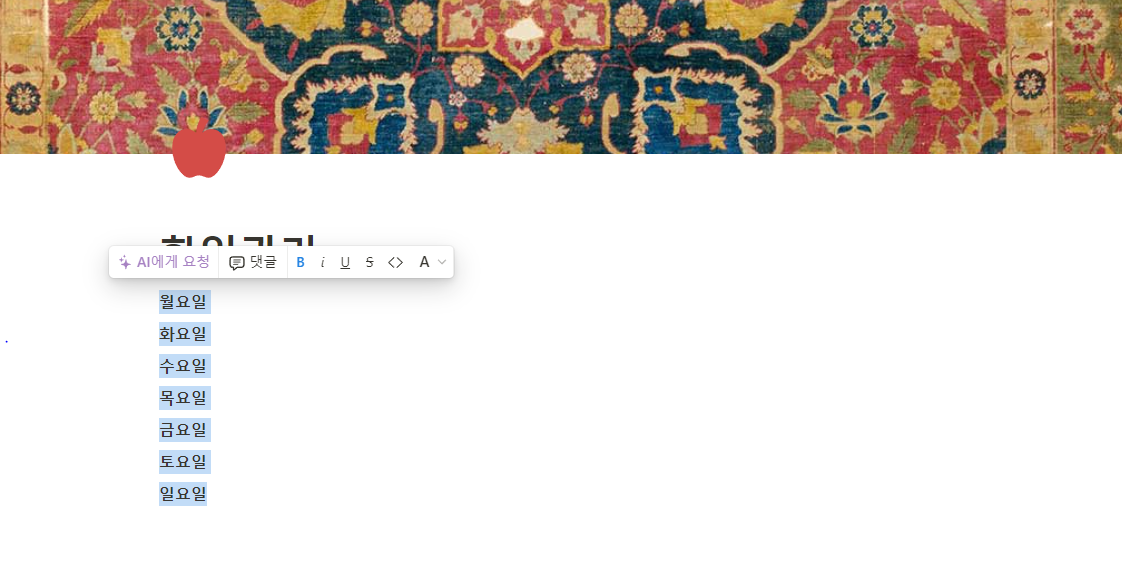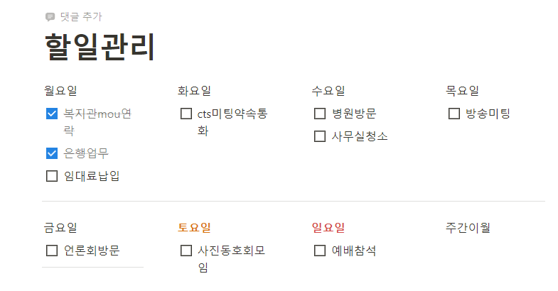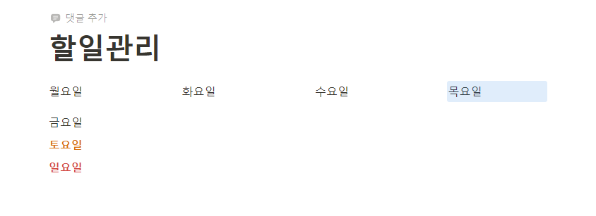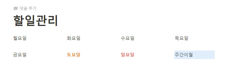 할일목록 페이지에서 월요일부터 일요일까지 텍스트로 입력합니다. 그리고 글자폰트를 진하게를 눌러 강조합니다. 보통 일요일과 토요일날의 색이 다르죠. 그 구분은 별도로 색상을 변경할 수 있습니다. 동일하게 토요일이나 일요일에 영역을 잡고 나서 글자색을 변경하시면 됩니다.